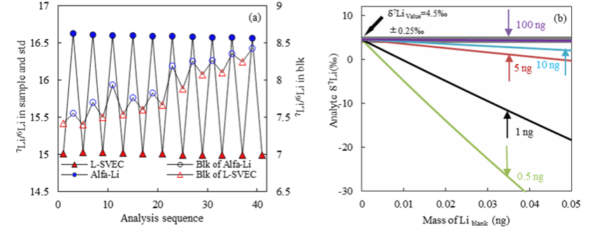 图1.(a)L-SVEC和Alfa-Li监控7Li/6Li空白(b)空白引起的Li实验偏差模拟。