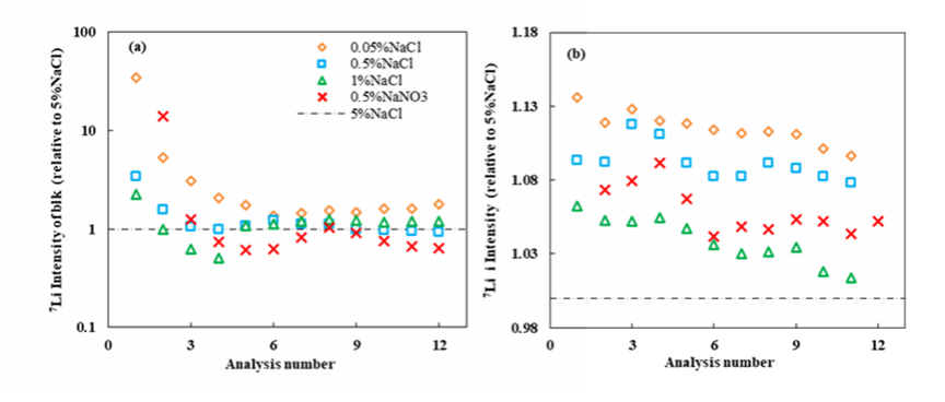 针对以上问题,中国地质大学(武汉)壳幔交换动力学科研团队的硕士研究生张甜甜在蔺洁副研究员的指导下,提出了一种降低记忆效应更有效的方法,即通入 5% NaCl 溶液1分钟,发现Li记忆效应显著降低,且背景Li信号降低了两个数量级,同时在3小时内保持信号强度稳定,仪器背景的清洗效率提高了3到5倍。该方法已被许多机构广泛采用,包括剑桥大学、印度科学研究所和 Thermo Fisher Scientific、贵阳地球化学研究所、中国科学院在内的众多机构广泛采用。然而,5% NaCl洗液浓度太高,可能对雾化器造成堵塞,英国剑桥大学、印度科学研究院、赛默飞世尔科技有限公司指出在Neptune plus MC-ICP-MS可以将NaCl 溶液的浓度由5% 降低到10ppm也可以降低Li的记忆效应。Bohlin et al.(2018)指出,在样品测定之前先通入Na单标溶液10min,空白将从100mV降低至0.5-3mV。为了进一步扩大NaCl降低记忆效应方法的应用,寻找更加合适浓度的溶液以及探究NaCl减少Li记忆效应的机制尤为重要。