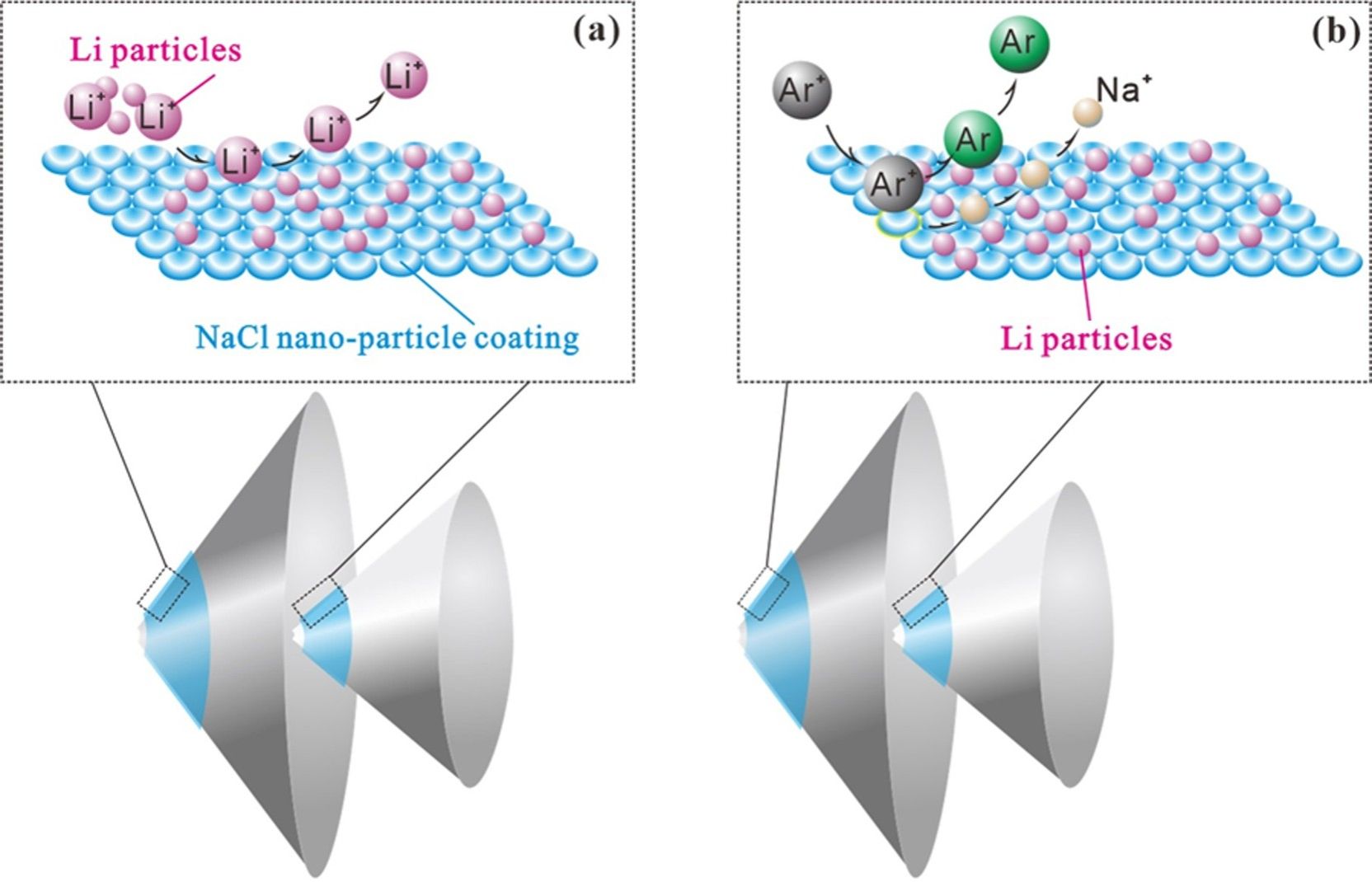 综上所述,我们的实验结果显示了两种合理的解释:1)NaCl溶液在锥体表面形成一层“Na等离子体镀膜”,使Li的化合物被抑制电离;2)NaCl溶液在锥体表面形成一层纳米颗粒,使Li的化合物被阻隔沉积(图4)。