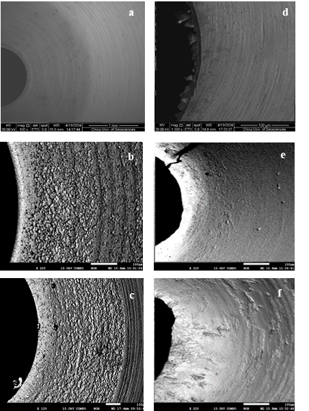 图3. 通入不同溶液的sampling (left)和skimmer (right)锥 的外侧;(a、d)为新锥;(b、e)只通入Li溶液;(c、f)通入Li-HNO3