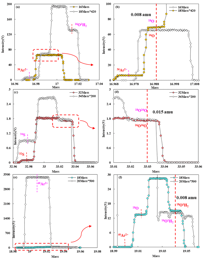 Ar-ICP直接暴露在大气之中,空气中的含氧组分可直接进入等离子体区域,致使16O⁺和(18O16O)⁺的背景强度极高,超出原有检测器量程,所以我们项目组对MC-ICP-MS的法拉第杯电阻进行了针对性改造—为低质量数粒子(16O、16O16O)检测所用的L4法拉第杯配备3×10⁹ Ω电阻,将检测器最大量程从50 V提高到1666 V,避免高空白信号溢出,确保能捕捉到完整的氧离子信号(图2)。结果显示:18O+易受36Ar2+和(16O1H2)+干扰,通过选择m/z=16.990的峰中心可隔绝(16O1H2)+干扰,结合副杯结构可准确扣除36Ar2+信号;18O16O⁺和16O16O+的主要干扰为34S⁺和32S⁺,选择m/z=33.03的峰中心即可避开;16O1H2+则受36Ar2+、18O+和40Ar2+共同干扰,需选择m/z=19.042的峰中心规避。