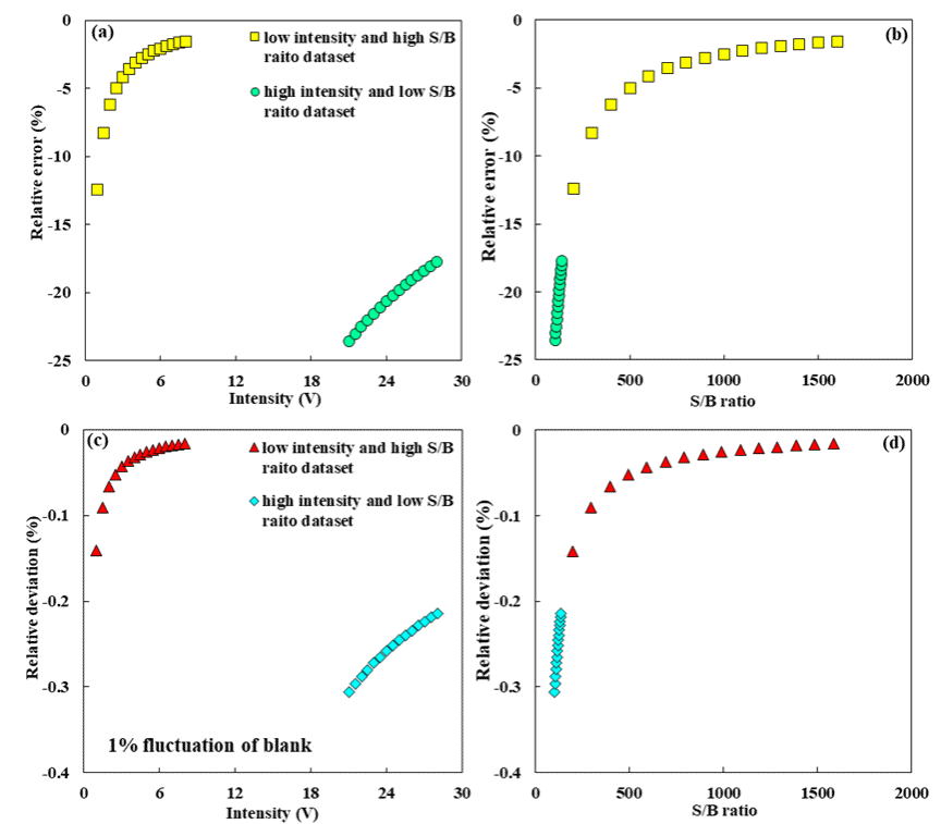 图4.模拟得到的信号强度、信噪比(S/B)与相对误差的关系。其中,相对误差(Relative error)通过计算值与样品真实组成的差值得到,相对偏差(Relative deviation)通过1%背景强度波动前后的样品组成差异得到