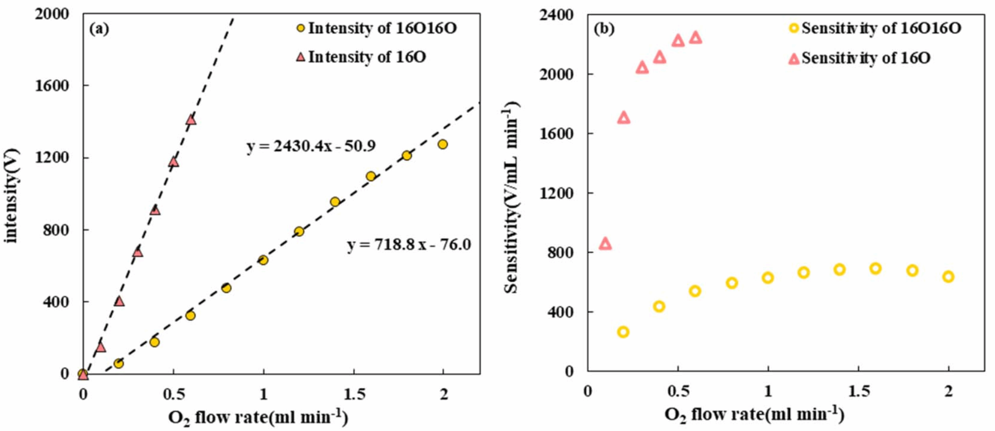 图3.氧气流速与16O和16O16O的信号强度(a)及灵敏度(b)的关系