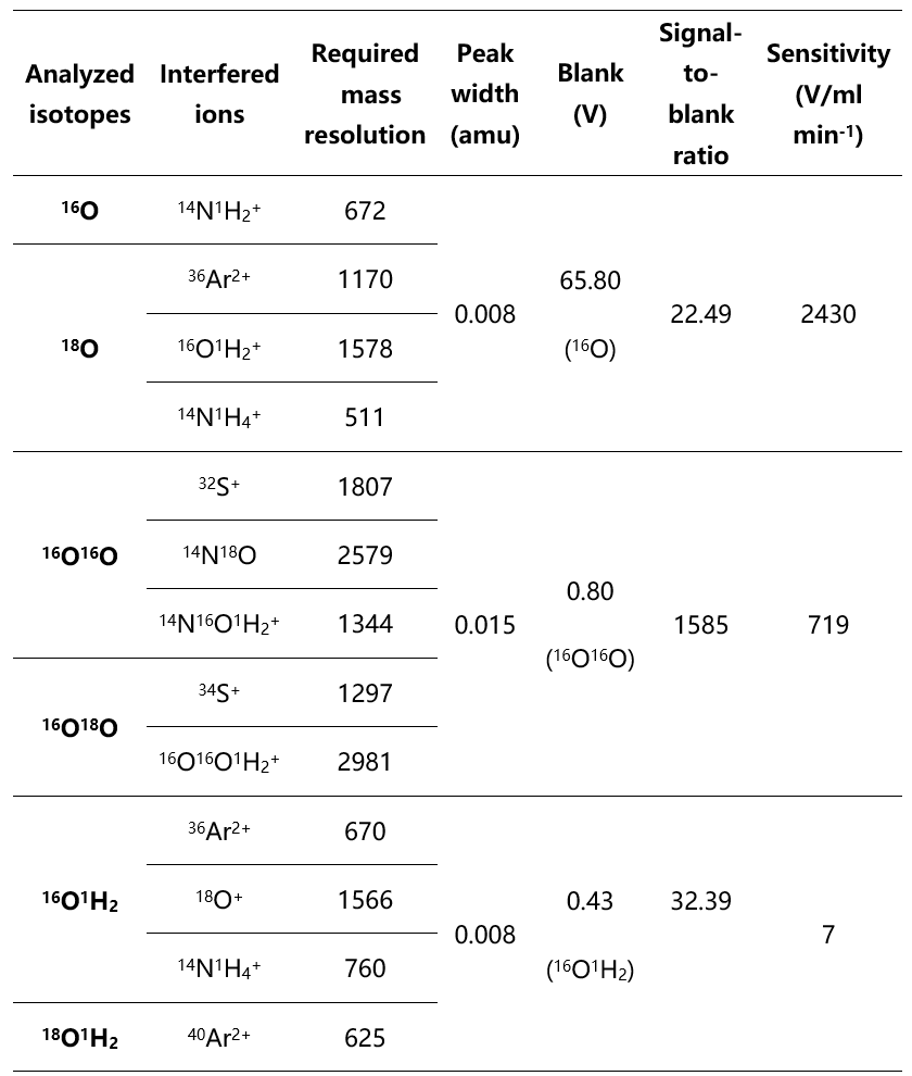 本文系统性对比了三种方案的灵敏度、信噪比(S/B)、峰宽和稳定性(表1)。实验探究O2流量(0-2 ml min-1)对两种方法的影响发现,18O/16O法在O2流量0.5 ml min-1、样品气流速1.29 L min⁻¹及射频功率1050 W条件下,灵敏度达2430 V/ml min-1,但背景值高达64 V,信噪比比仅22.49,超过该流量信号会超出法拉第杯阈值,而18O16O/16O16O在O2流量1.6 ml min-1、样品气流速1.254 L min-1及射频功率1050 W条件下,灵敏度约680 V/ml min-1,背景值仅0.8 V,信噪比高达1585.25,1.8 ml min-1后信号与流量呈非线性关系(图3)(Wu et al., 1994; Polyakova et al., 2020)。结果显示:18O/16O方案灵敏度最高(2430 V/ml min⁻¹),但背景极高(65.8 V),信噪比仅22.49;18O1H2/16O1H2方案灵敏度极低(7 V/ml min⁻¹),无法满足高精度分析需求,所以后文不再对此方法进行讨论。