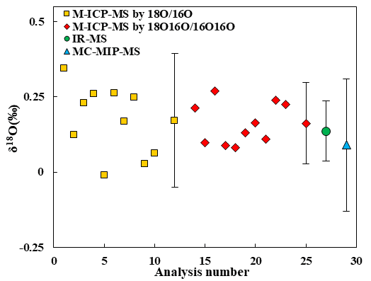 将优化后的18O16O /16O16O方案应用于氧气样品分析,并与传统IRMS(MAT253 Plus)和MC-MIP-MS的测试结果对比(图4)。MC-ICP-MS测得的δ18O值为0.16±0.16‰(2SD,n=10),与IRMS(0.13±0.1‰,2SD,n=10)和MC-MIP-MS(0.14±0.22‰,2SD,n=6)结果在误差范围内高度一致(图6),保证了方法的可靠性。