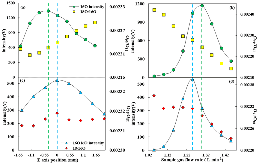 图5. Z轴位置(a)(c)和样品气流速(b)(d)对信号强度和氧同位素比值的影响
